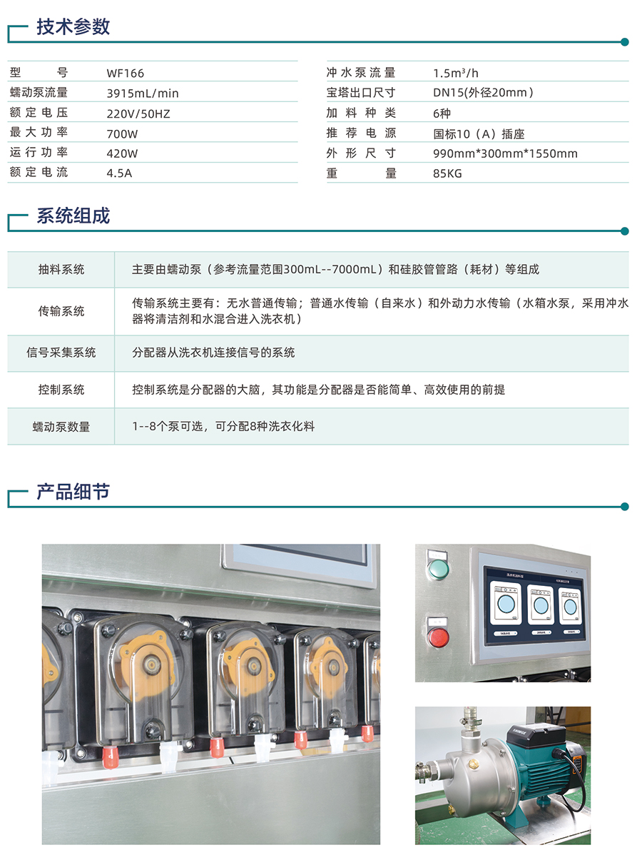 5) 蠕動(dòng)泵數(shù)量:1--8個(gè)泵可選,可分配8種洗衣化料。